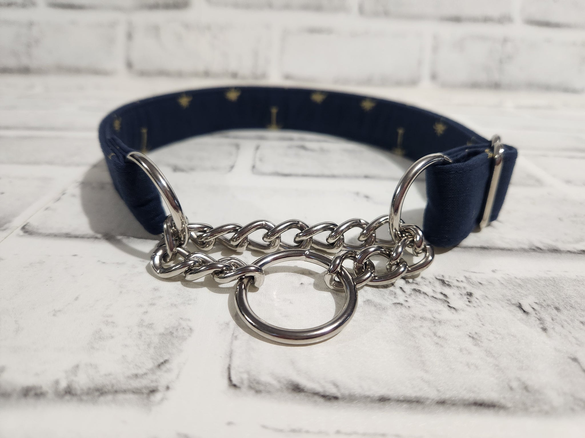 Navy with Gold Palm Trees 1" Medium Chain Martingale Collar 12"-19"